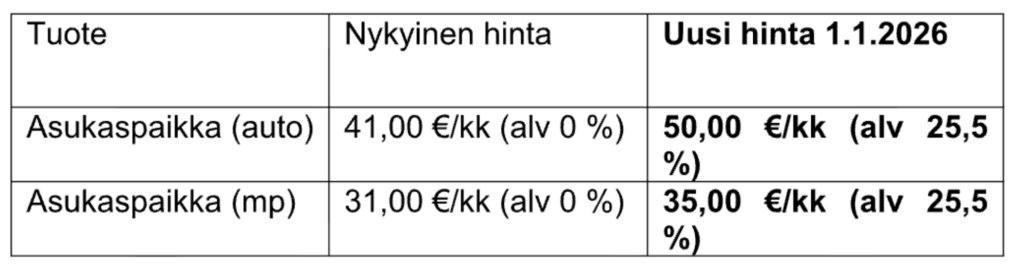 PYSÄKÖINTITUOTTEIDEN HINNANMUUTOS 1.1.2026
